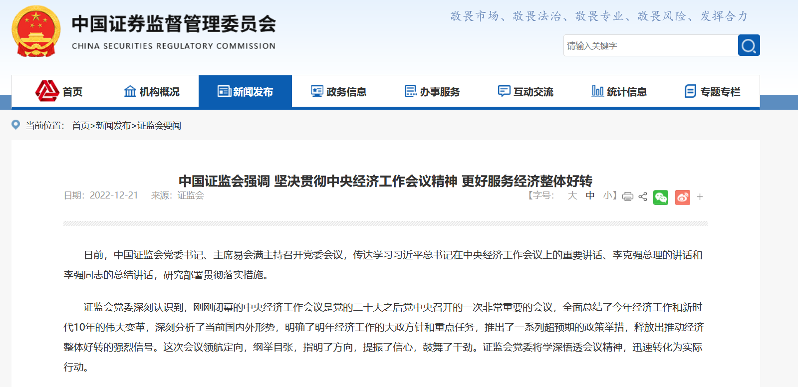 大公房产讯 12月21日,证监会官网发布《中国证监会强调坚决贯彻中央经济工作会议精神 更好服务经济整体好转》。