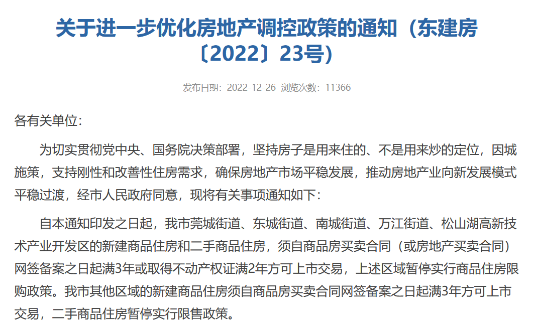 通知显示,东莞市莞城街道、东城街道、南城街道、万江街道、松山湖高新技术产业开发区的新建商品住房和二手商品住房,须自商品房买卖合同(或房地产买卖合同)网签备案之日起满3年或取得不动产权证满2年方可上市交易,上述区域暂停实行商品住房限购政策。