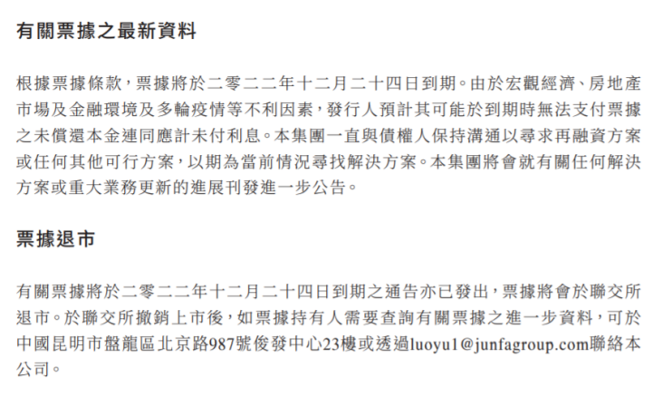 同时,俊发集团通知,由于该等票据于2022年12月24日到期,票据将从港交所退市。