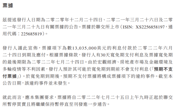在此之前,俊发集团曾要求该票据自2022年7月25日上午九时正起于联交所暂停买卖。根据票据条款,俊发地产有30天宽免期支付利息及票据宽免期的最后期限为2022年7月24日。由于宏观经济、房地产市场及金融环境及多轮疫情等不利因素,发行人预计其可能于宽免期到期前不会支付利息。于宽免期到期后,预期不支付票据将构成票据项下的违约事件。