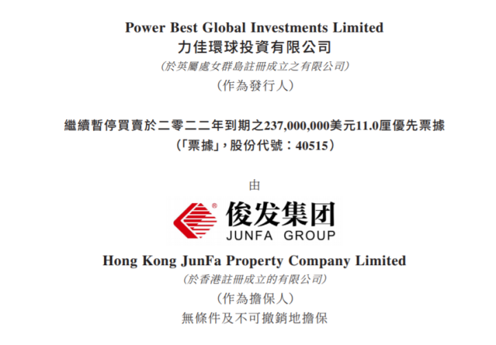 据了解,该票据发行规模2.37亿美元,息票率11%,于2022年12月24日到期,由力佳环球投资有限公司(Power Best Global Investments Limited)发行,俊发集团提供担保。俊发集团表示,由于宏观经济、房地产市场、金融环境等不利因素影响,公司预计无法偿付到期票据的未偿本金及应付利息。集团一直与债权人沟通,探讨再融资或任何其他可行方案,以寻求解决目前情况的办法。集团将就任何解决方案的进展或重大业务更新作出进一步公告。