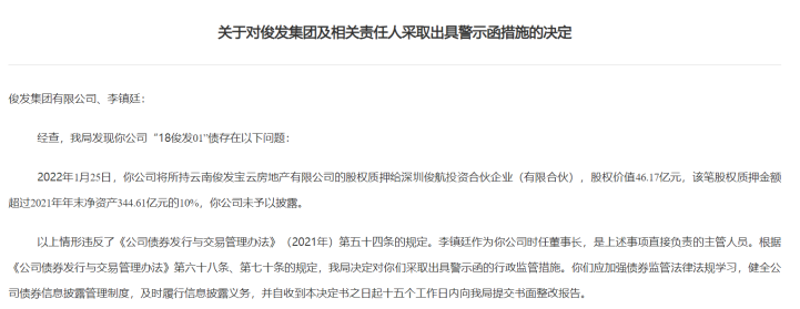 就在前不久,俊发集团以及时任董事长李镇廷因“18俊发01”存在信批违规问题,被云南证监局下发警示函。据云南证监局信息,因为2022年1月25日,俊发集团将所持云南俊发宝云房地产有限公司的股权质押给深圳俊航投资合伙企业(有限合伙),股权价值46.17亿元,该笔股权质押金额超过2021年年末净资产344.61亿元的10%,而俊发集团未予以披露。