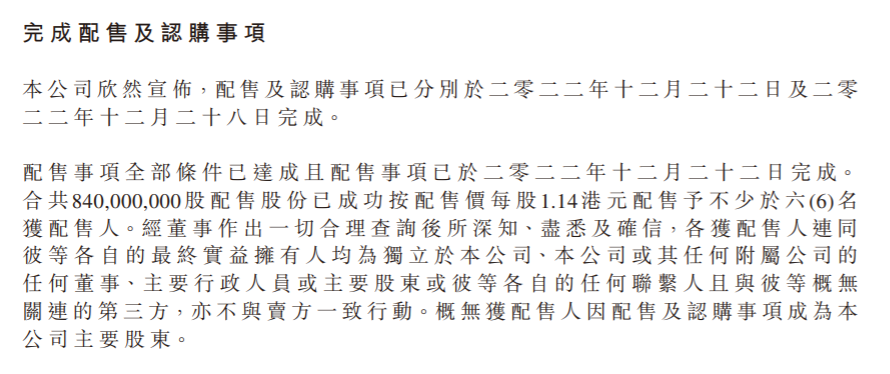 据悉,合计8.4亿股已成功按配售价每股1.14港元配售予不少于6名获配售人,认购股份相当于认购事项完成后经扩大的已发行股份总数约8.07%。公司自认购事项收取的所得款项净额约为9.46亿港元。