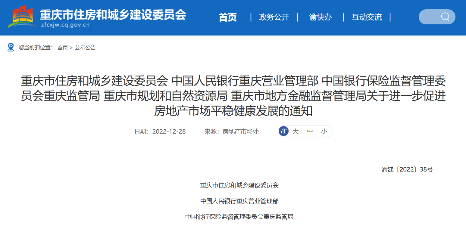 大公房产讯 12月28日,重庆市住房城乡建委、重庆市地方金融监督管理局等发布《关于进一步促进房地产市场平稳健康发展的通知》(以下简称“通知”)。