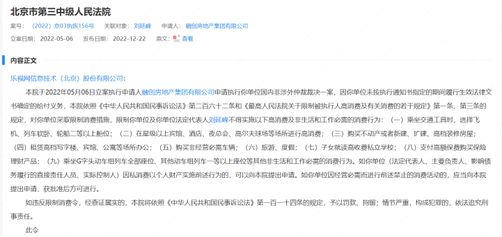 大公房产讯 企查查显示,近日,北京市第三中级人民法院发布限制消费令。详情显示,乐视网信息技术(北京)股份有限公司(以下简称“北京乐视网”)及其法人刘延峰,因未按执行通知书指定的期间履行生效法律文书确定的给付义务,被限制高消费。