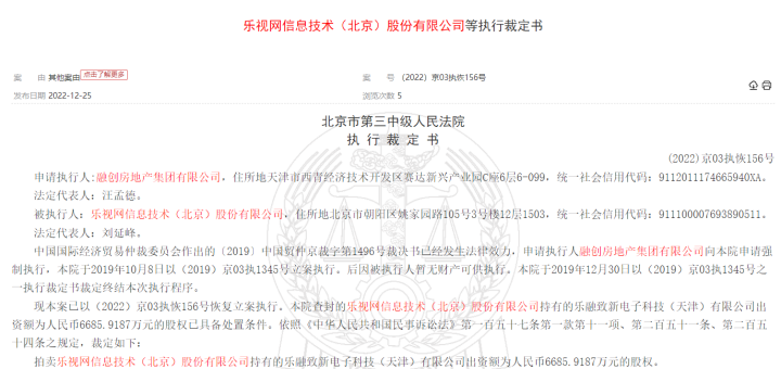2022年12月25日,北京市第三中级人民法院发布执行裁定书显示,该案已以(2022)京03执恢156号恢复立案执行,法院裁定拍卖北京乐视网持有的乐融致新电子科技(天津)有限公司出资额为6685.9187万元的股权。