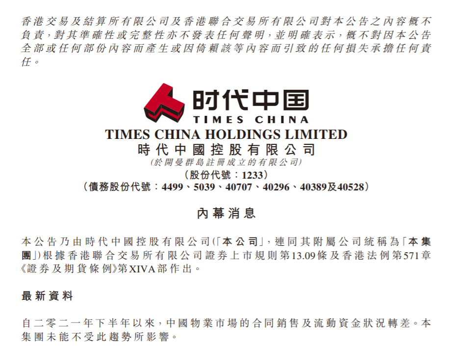 大公房产讯 12月30日,时代中国控股有限公司发布公告称,自2021年下半年以来,中国物业市场的合同销售及流动资金状况转差,集团未能不受此趋势所影响。