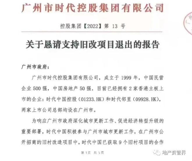 但在今年上半年,时代中国曾发布关于恳请支持旧改项目退出的报告。报告称,因受多方位政策叠加调控,房地产企业融资渠道受限,项目销售回款显著下滑,严重影响我司现金流稳定性,而旧改项目沉淀我司大量资金,为顺利渡过当前阶段性困难,恳请市政府支持企业纾困解难。