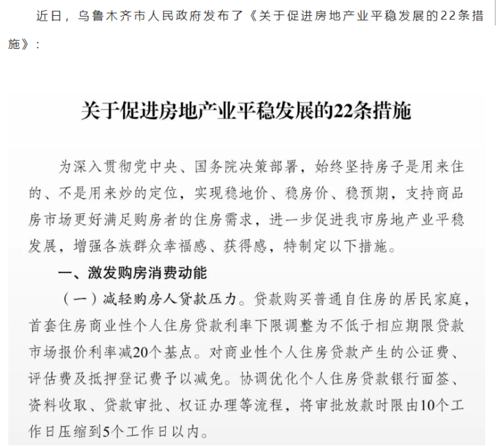 大公房产讯 据乌鲁木齐市房产局官方公众号信息,近日,乌鲁木齐市人民政府发布了《关于促进房地产业平稳发展的22条措施》(以下简称《措施》)。
