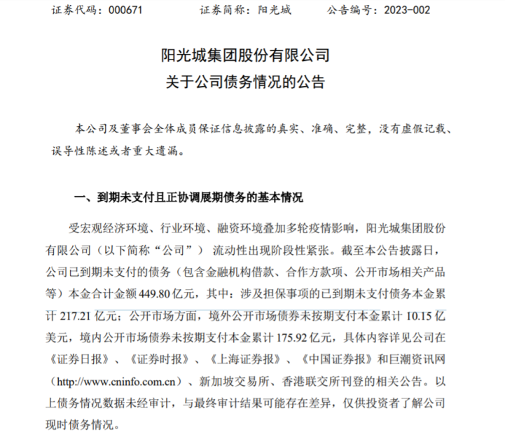 截至公告披露日,阳光城已到期未支付的债务(包含金融机构借款、合作方款项、公开市场相关产品等)本金合计金额449.80亿元。其中涉及担保事项的已到期未支付债务本金累计217.21亿元;公开市场方面,境外公开市场债券未按期支付本金累计10.15亿美元,境内公开市场债券未按期支付本金累计175.92亿元。