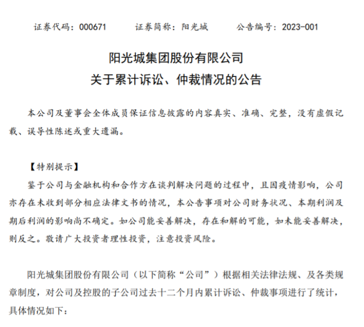 值得关注的是,2023年1月4日,阳光城因债务到期未能清偿、并未及时披露信息问题,收到中国证监会福建监管局警示函。