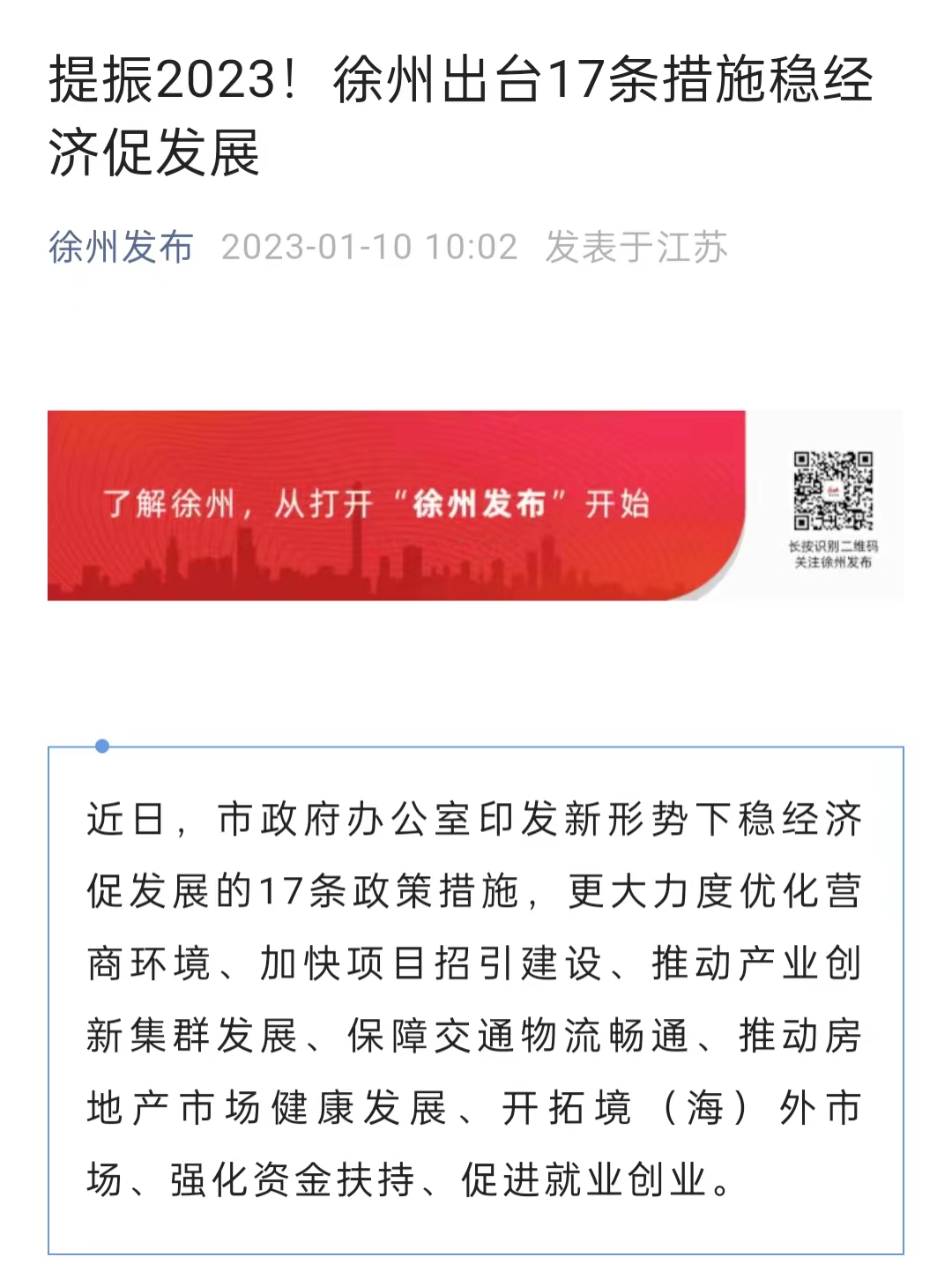 大公房产讯 1月10日,据微信公众号“徐州发布”消息,近日,江苏省徐州市政府办公室印发新形势下稳经济促发展的17条政策措施,更大力度优化营商环境、加快项目招引建设、推动产业创新集群发展、保障交通物流畅通、推动房地产市场健康发展、开拓境(海)外市场、强化资金扶持、促进就业创业。