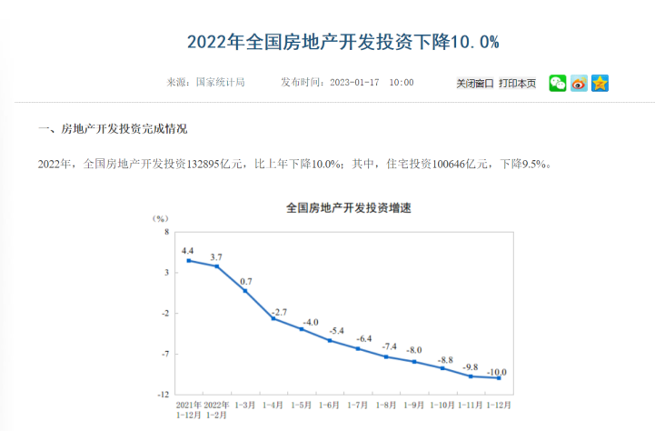据悉,2022年,全国房地产开发投资132895亿元,比上年下降10.0%;其中,住宅投资100646亿元,下降9.5%。