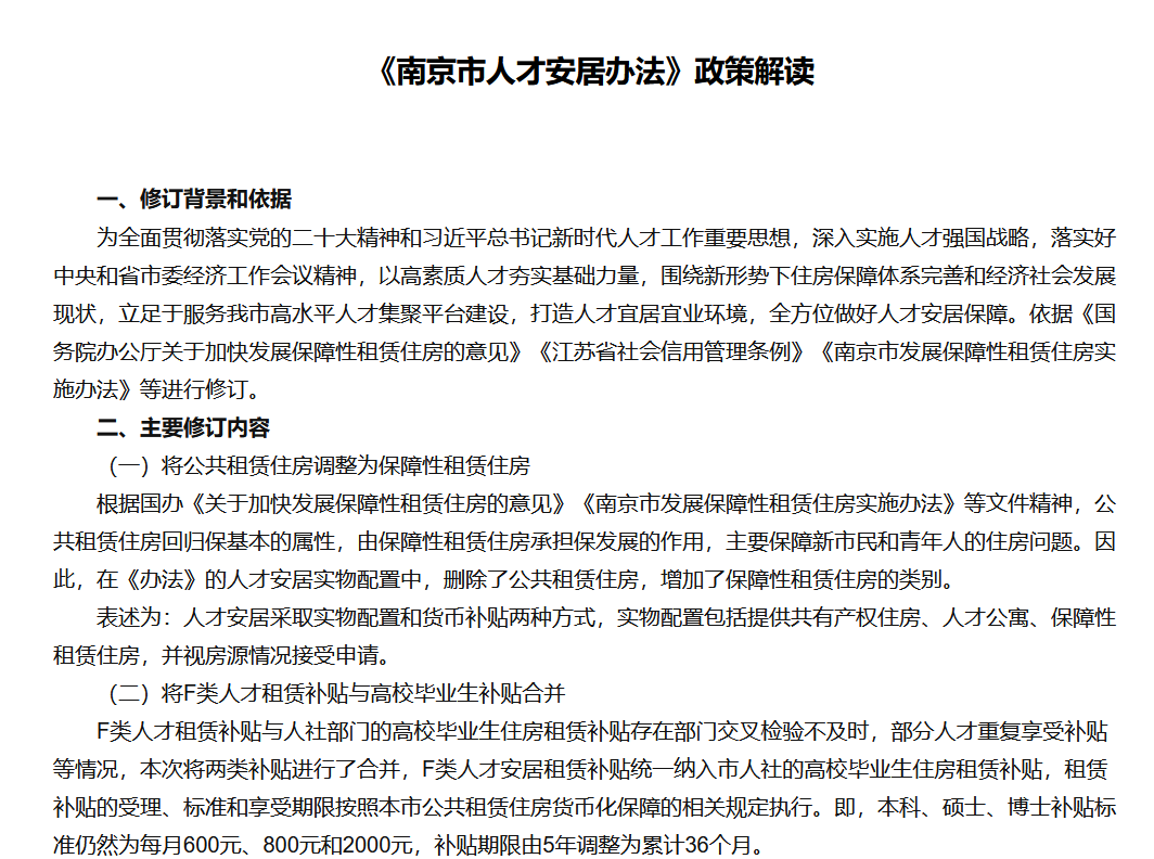 因F类人才租赁补贴与人社部门的高校毕业生住房租赁补贴存在部门检验交叉、部分人才重复享受补贴等情况,本次修订中将两类补贴进行了合并,F类人才安居租赁补贴统一纳入市人社的高校毕业生住房租赁补贴,租赁补贴的受理、标准和享受期限按照本市公共租赁住房货币化保障的相关规定执行,即:本科、硕士、博士补贴标准仍然为每月600元、800元和2000元,补贴期限由5年调整为累计36个月。