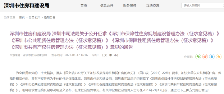 大公房产讯 1月17日,深圳市住房和建设局、深圳市司法局发布关于公开征求《深圳市保障性住房规划建设管理办法(征求意见稿)》《深圳市公共租赁住房管理办法(征求意见稿)》《深圳市保障性租赁住房管理办法(征求意见稿)》《深圳市共有产权住房管理办法(征求意见稿)》意见的通告。