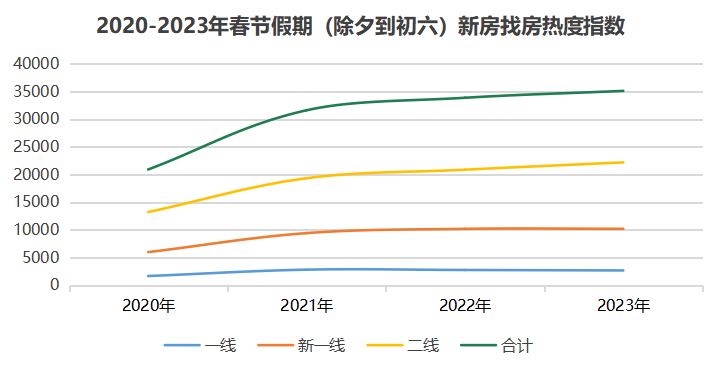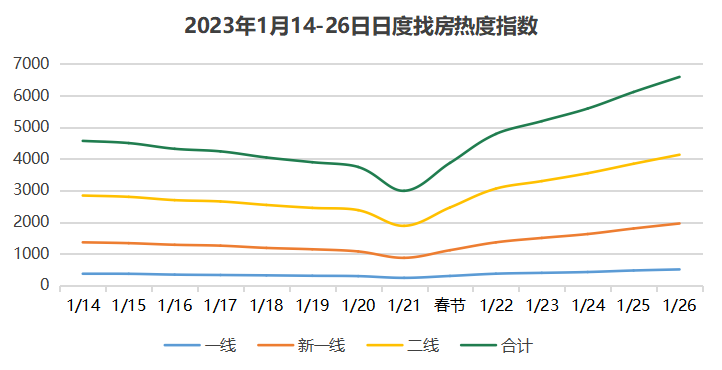 58安居客研究院统计数据显示:2023年春节假期期间各线城市找房热度较前一周均有大幅上涨,58安居客研究院院长张波认为,主要是因为春节期间各种促销活动,吸引客户线上看房,其中一线城市上涨16.6%,新一线城市上涨18.4%,二线城市涨幅最大,达到21%;合计上涨19.9%;从日度变化来看,1月14日-到除夕,各线城市找房热度逐日下降,春节开始,找房热度呈现出逐日回升的态势。