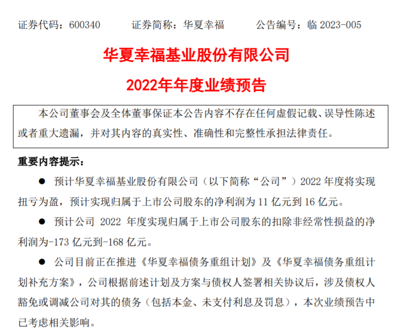 报告显示,华夏幸福预计2022年度将实现扭亏为盈,实现归属于上市公司股东的净利润为11亿元到16亿元;预计实现归属于上市公司股东的扣除非经常性损益的净利润为-173亿元到-168亿元。
