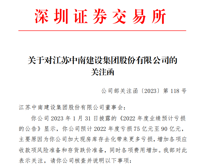 针对公司亏损预计继续加大的情况,2月1日晚间,深交所将目光投向了中南建设。