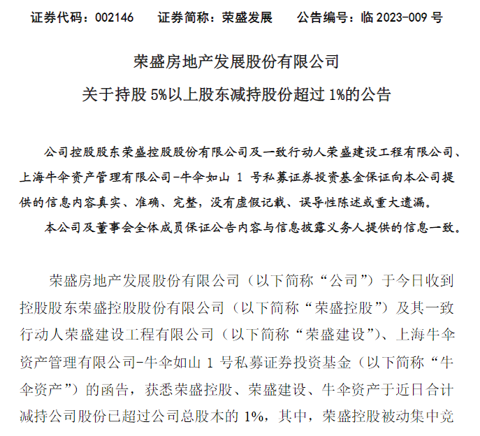 大公房产讯 2月2日晚间,荣盛发展发布公告称,控股股东荣盛控股及其一致行动人荣盛建设、牛伞资产,于近日合计减持公司股份数量6344.9121万股,减持比例达1.46%。