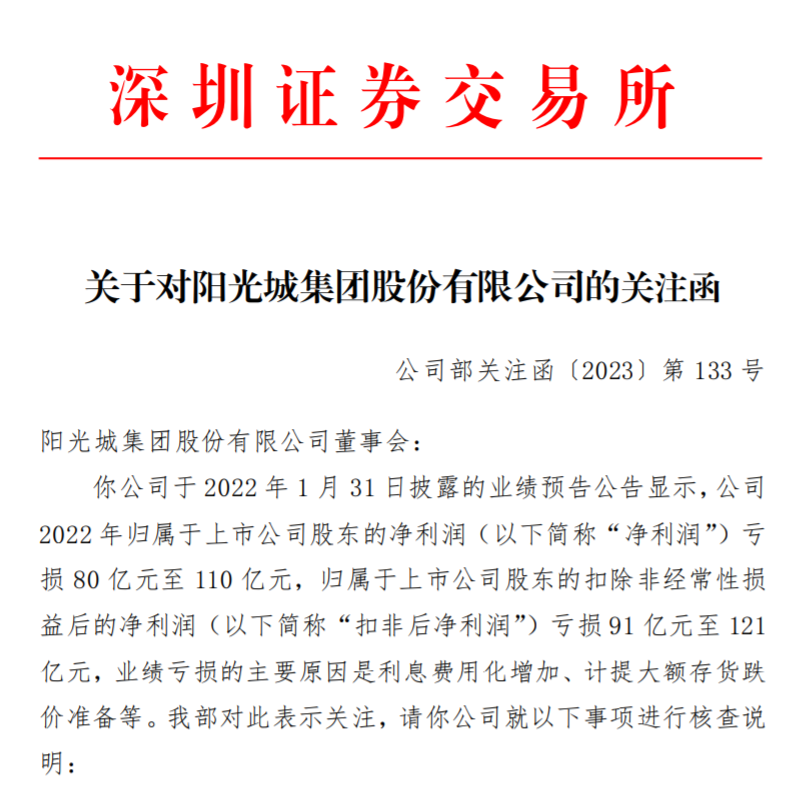 公告显示,阳光城于1月31日发布的业绩预告公告显示,阳光城2022年归属于上市公司股东的净利润亏损80亿元至110亿元,归属于上市公司股东的扣除非经常性损益后的净利润亏损91亿元至121亿元,业绩亏损的主要原因是利息费用化增加、计提大额存货跌价准备等。