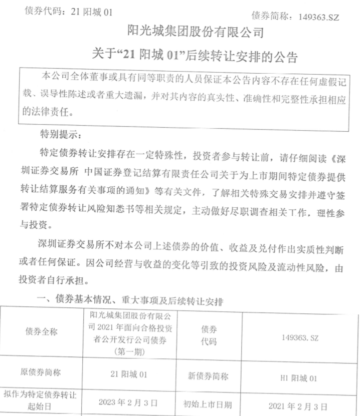 公告显示,上述债券为“21阳城01”,阳光城未能在2023年1月30日按照约定偿付2021年1月22日至2023年1月21日期间利息(1.38亿元)以及回售本金(约1.8亿元)。阳光城表示,将该债券转换成新债券“H1阳城01”,拟作为特定债券转让起始日为2023年2月3日,债券期限为5年期,第2年末和第4年末附发行人调整票面利率选择权和投资者回售选择权。