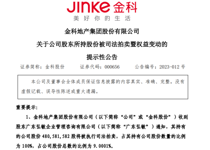 公告显示,金科股份收到股东广东弘敏企业管理咨询有限公司(以下简称“广东弘敏”)通知,其持有的公司股份约4.8058亿股将被执行司法拍卖,占其持有公司股份数量的比例为100%,占公司股份总数的比例为9.0001%。据悉,此次拍卖时间拟定于2023年3月8日10时至2023年3月9日10时止(延时除外),设计股份将分三笔1.59亿股、1.62亿股及1.59亿股在“京东网”进行公开网络司法拍卖。