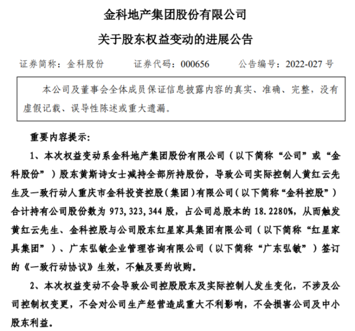 2022年1月6日,广东弘敏、红星家具集团与黄红云、金科控股签订《一致行动人协议》;1月14日,黄红云与陶虹遐及女儿黄斯诗宣布解除一致行动人关系;2月9日,黄红云与红星系签订的《一致行动人协议》正式生效,合计持股约29.36%。