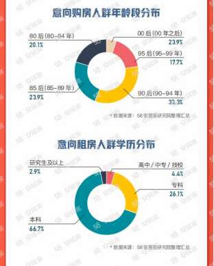 为充分反映节后租房人群的租房状况,了解当前的租房需求、偏好等问题,58同城、安居客《2023节后返城租房调查报告》调研人群聚焦在2023年4月份之前有租房需求的人。这些意向租客工作生活在一线及新一线城市,以80后~95后为主,其中90后租客占比33.3%,85后租客占比23.9%。学历方面,调研人群中拥有本科学历的租客占比66.7%,研究生以上学历的租客占比2.9%。
