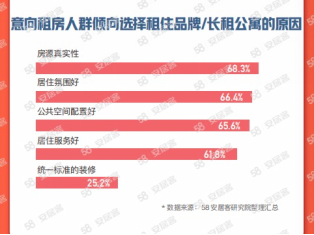 对于为什么选择品牌公寓/长租公寓,58同城、安居客《2023节后返城租房调查报告》统计显示,其房源的真实性、良好的居住氛围、优秀的公共空间配置及令人满意的居住服务是大家选择租住的主要原因。