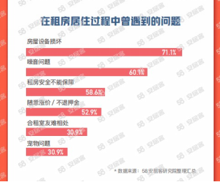 居住在租到的房子中,大家也遇到了一些麻烦。有57.5%的租客表示遇到房屋设备损坏的问题,44.7%的租客遇到过噪音问题,29.0%的人表示租房安全难以保障,还有随意涨价、押金问题、合租室友的问题等。