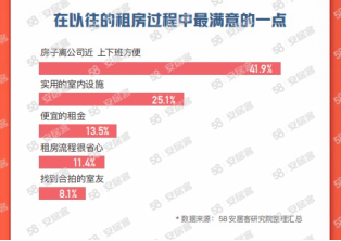 但在租房的过程中,也有很多令人满意的体验。41.9%的人表示在租房时找到了离公司近的房源,上下班很方便;有25.1%的人在租房时最满意房子的室内设施。13.5%的人表示租到了划算的房子,租金较为便宜;也有人觉得“租房流程很省心”,调研数据显示,选择此项的租客中有65.8%的人选择通过专业线上找房平台找房租房,省心的租房流程带来了良好的租房体验;还有人觉得合租虽然牺牲了一部分居住空间,但找到了合拍的室友,也是租房时带来的不错的收获。