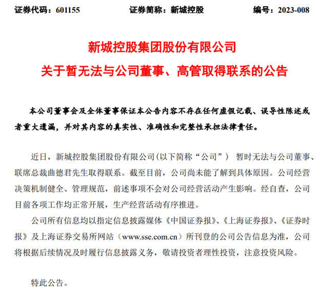 新城控股方面表示,公司经营决策机制健全、管理规范,前述事项不会对公司经营活动产生影响。经自查,公司目前各项工作均正常开展,生产经营活动有序推进。
