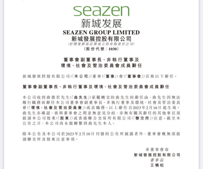 大公房产讯 最近的新城可谓是“多事之秋”。曲德君失联一周后,2月16日,新城发展发布公告称收到曲德君家属转交的辞任函,曲德君因无法履行职务而辞任公司董事会副董事长、非执行董事及环境、社会及管治委员会成员职务。以上辞任自2023年2月16日起生效。