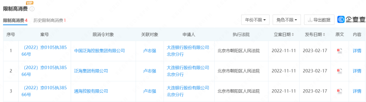 大公房产讯 企查查显示,近日,通海控股有限公司、中国泛海控股集团有限公司、泛海集团有限公司因未履行生效法律文书确定的义务,被北京市朝阳区人民法院限制高消费,关联对象为卢志强。