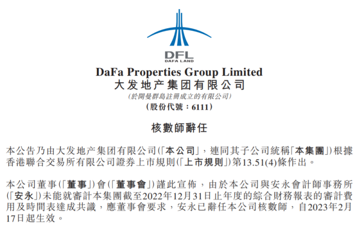 大公房产讯 2月20日晚间,大发地产发布公告称,由于公司与安永会计师事务所未能就审计集团截至2022年12月31日止年度的综合财务报表的审计费用及时间表达成共识,应董事会要求,安永已辞任公司核数师,自2023年2月17日起生效。
