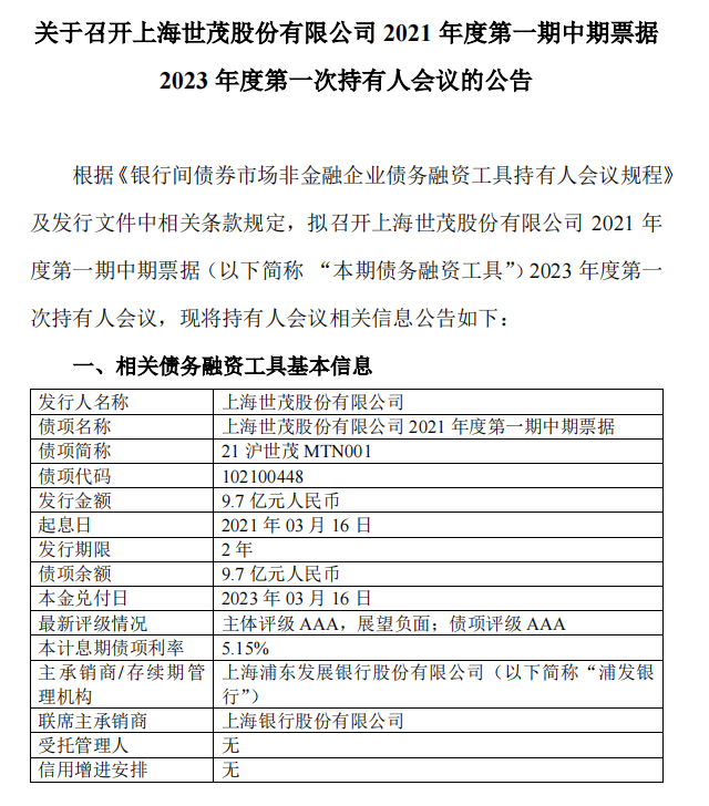 据悉,该会议涉及债券21沪世茂MTN001,发行金额9.7亿元,发行期限为两年,本金兑付日为2023年3月16日,本计息期债项利率5.15%,主承销商、存续期管理机构为上海浦东发展银行股份有限公司。最新评级为主体评级AAA,展望负面;债项评级为AAA。