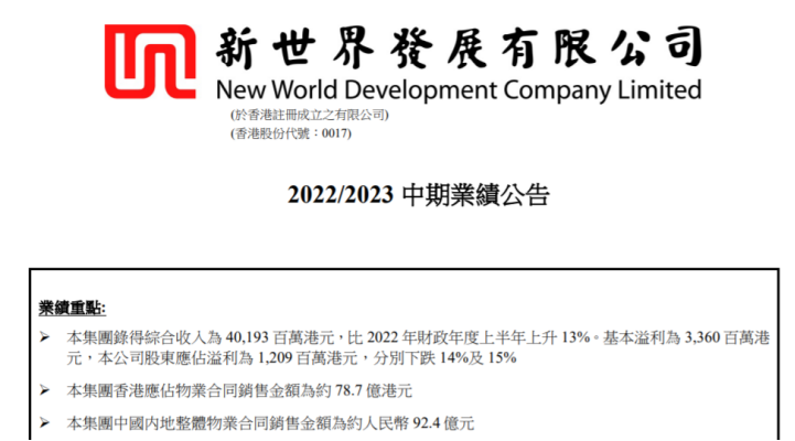 大公房产讯 2月23日,新世界发展发布2022/2023中期业绩公告。报告期内,集团录得综合收入为401.93亿港元,同比增长13%;基本溢利为33.6亿港元,同比下降14%;股东应占溢利为12.09亿港元,同比下降15%;2023财政年度中期股息每股0.46港元。