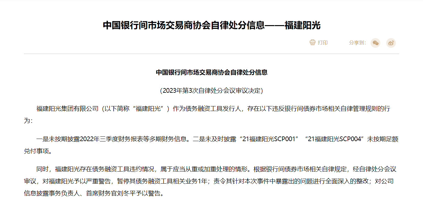 据悉,福建阳光集团一是未按期披露2022年三季度财务报表等多期财务信息。二是未及时披露“21福建阳光SCP001”“21福建阳光SCP004”未按期足额兑付事项。同时,福建阳光存在债务融资工具违约情况,属于应当从重或加重处理的情形。