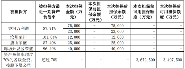 此外,荣盛发展全资子公司香河万利通还与中国华融资产管理股份有限公司河北省分公司拟继续合作业务18,200万元,由公司继续为上述业务提供连带责任保证担保,上述保证担保总额不超过23,000万元,担保期限不超过60个月。同时,公司全资子公司沧州荣盛以其自有资产为上述融资提供抵押担保。