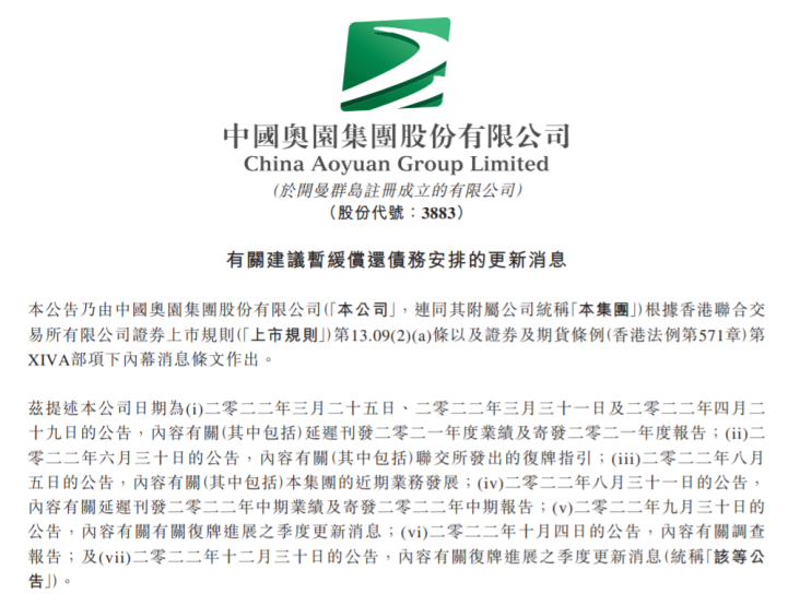 大公房产讯 2月28日,中国奥园(3883.HK)发布有关建议暂缓偿还债务安排的更新消息。
