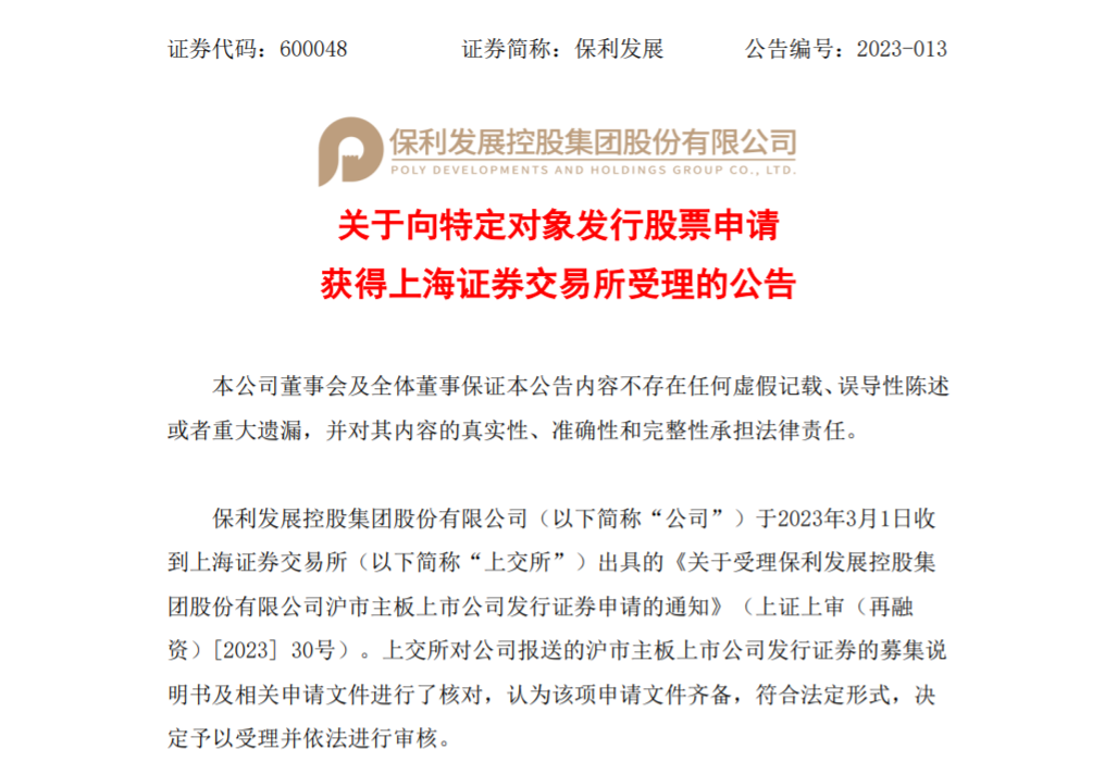 大公房产讯 3月1日,保利发展收到上海证券交易所(以下简称“上交所”)出具的《关于受理保利发展控股集团股份有限公司沪市主板上市公司发行证券申请的通知》。