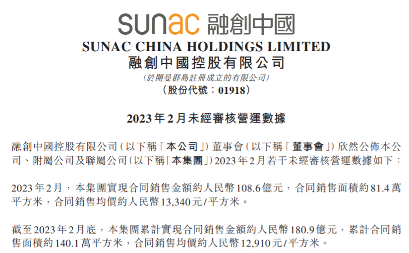 截至2023年2月底,融创中国累计实现合同销售金额约180.9亿元,累计合同销售面积约140.1万平方米,合同销售均价约人民币12910元/平方米。