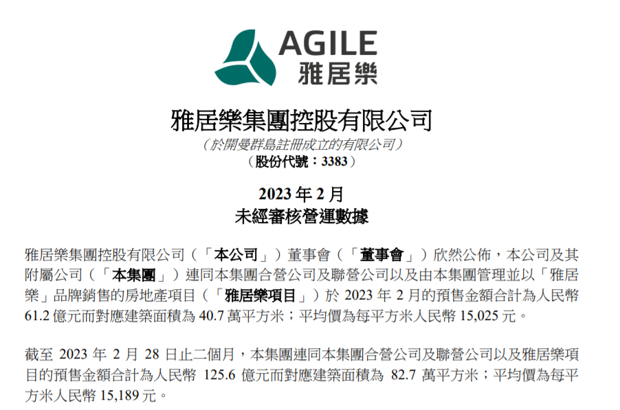 截至2023年2月28日止二个月,雅居乐集团预售金额合计为125.6亿元,同比下降约10.92%,对应建筑面积为82.7万平方米,同比下降约20.19%;平均价为每平方米15189元。