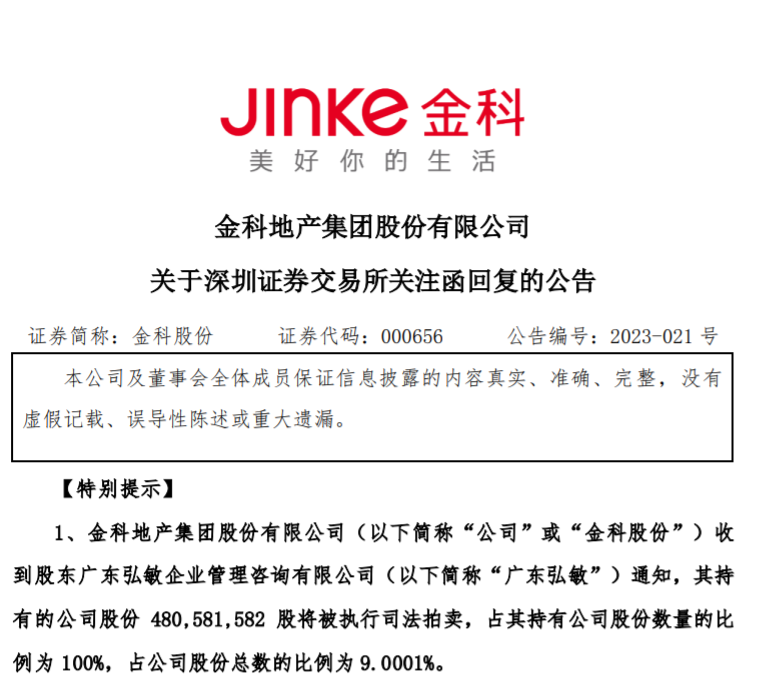 在回复中,金科股份表示,2023年1月17日,上海金融法院作出《执行裁定书》及《执行裁定书》,因相关债务人未能履行方圆公证处出具的公证书项下的义务,裁定变价广东弘敏合计持有的金科股份4.8058亿股股票(占总股本的9.0001%,占广东弘敏持股总数的100%)。上述持股拟定于2023年3月8日10时至2023年3月9日10时止(延时除外)分三笔1.59亿股、1.62亿股及1.59亿股对被执行股票进行公开网络司法拍卖。