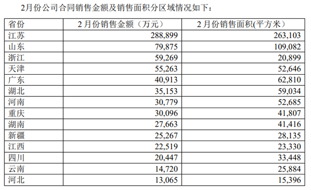 具体从地区来看,今年2月,新城控股销售额最高的省份为大本营江苏,达28.89亿元,销售面积约26.31万平方米。其次为山东,销售额为7.99亿元,销售面积约10.90万平方米。