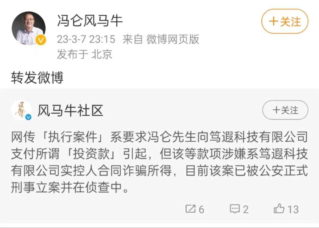 大公房产讯 3月7日晚间,针对近日新增被执行人信息,万通创始人冯仑在其官方微博回应称:网传“执行案件”系要求冯仑向笃遐科技有限公司支付所谓“投资款”引起,但该等款项涉嫌系笃遐科技有限公司实控人合同诈骗所得,目前该案已被公安正式刑事立案并在侦查中。