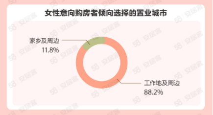 58同城、安居客调研显示,与男性购房者相比,更多女性愿意留在工作地买房,选择在工作地及周边城市购房的女性购房者占比88.2%,高于同时期的男性购房者占比。