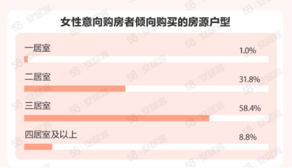 对所有购房者而言,户型都是需要重点考虑的因素之一。58同城、安居客《2023年女性置业调查报告》数据显示,在女性购房者中,倾向购买三居室的占比最高,达58.4%,其次有31.8%的女性选择购买两居室,分别仅有8.8%和1%的女性准备购买四居室和一居室。