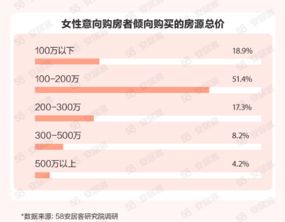 房屋总价方面,多数女性倾向购买总价在100万-200万的房源,占比为51.4%,其次有18.9%的女性倾向购买100万元以下的房子,17.3%的女性计划购买200万-300万的房子。