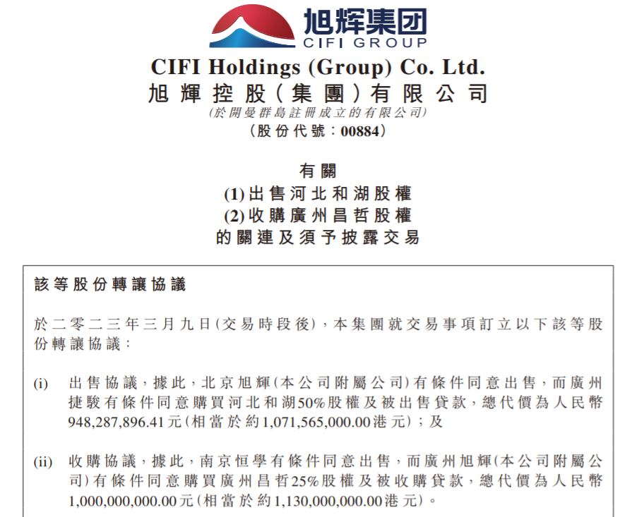 大公房产讯 3月9日,旭辉控股集团发布有关出售河北和湖股权、收购广州昌哲股权关联交易的公告。
